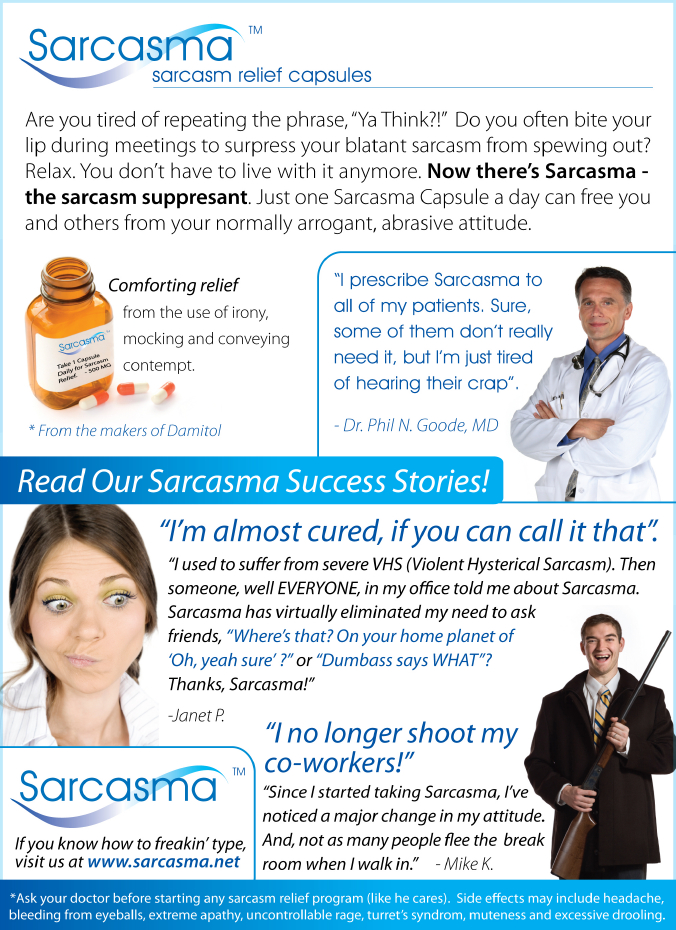 Dorothy sent us this little pharmaceutical gem. Now, you too can be cured of VHS (Violent Hysterical Sarcasm). Not sure where the ad originally came from, but we have a copy of the full-sized ad here.
